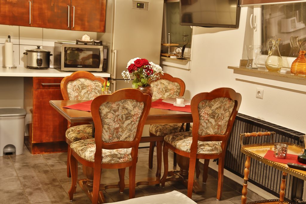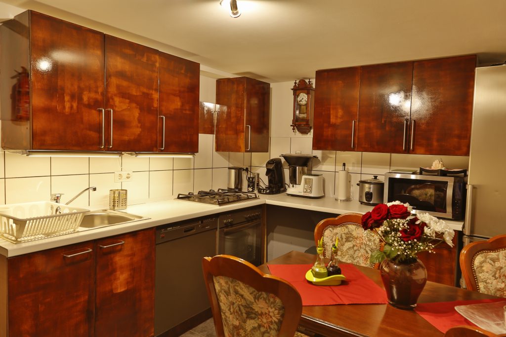 Die Küche ist voll ausgestattet besteht aus Kühl-Gefrierkombination, einen Gasherd, Spühlmaschiene, aussreichend Geschier zum Kochen und Essen. Eine Mikrowelle ist auch vorhanden.