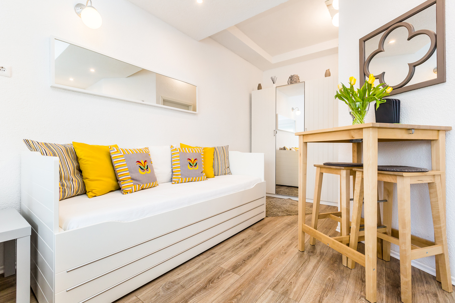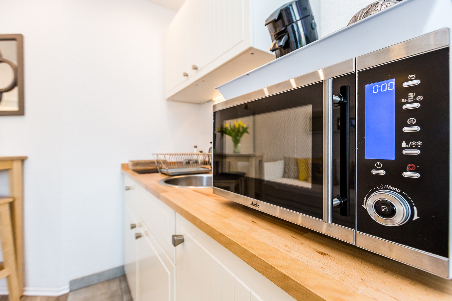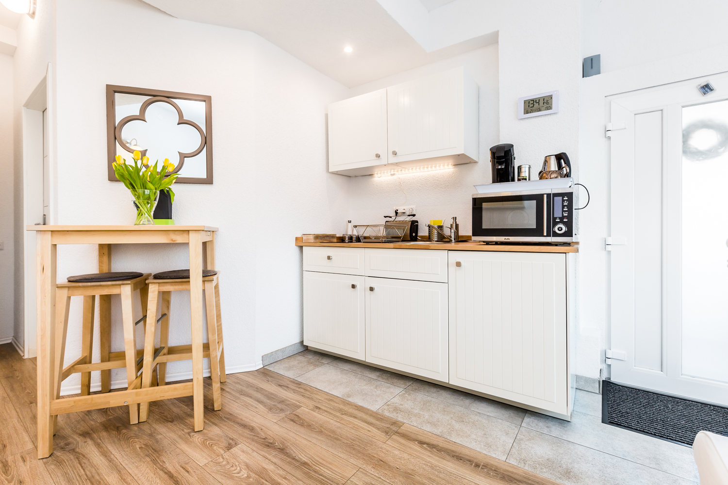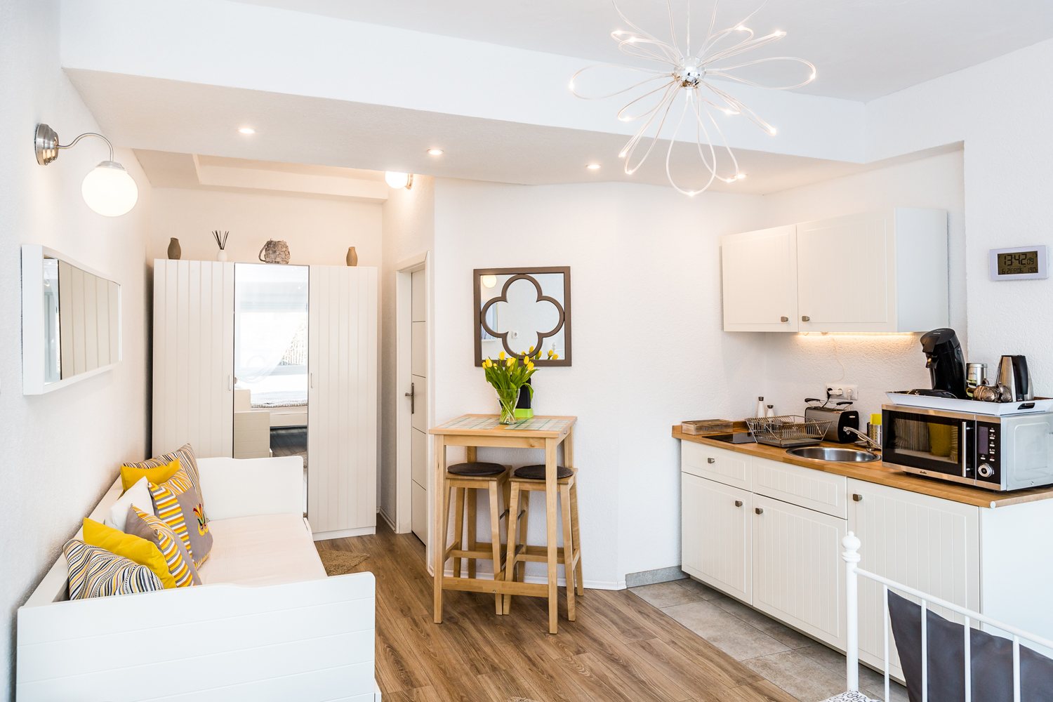Die Küche ist voll eingerichtet für bis zur 4 Personen. Darüber hinaus eine gemütliche Sitzgruppe.