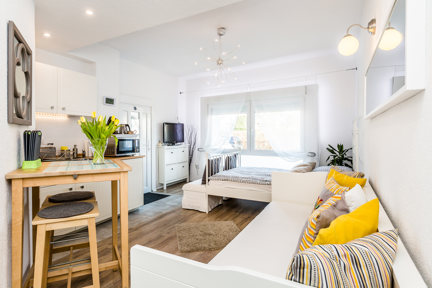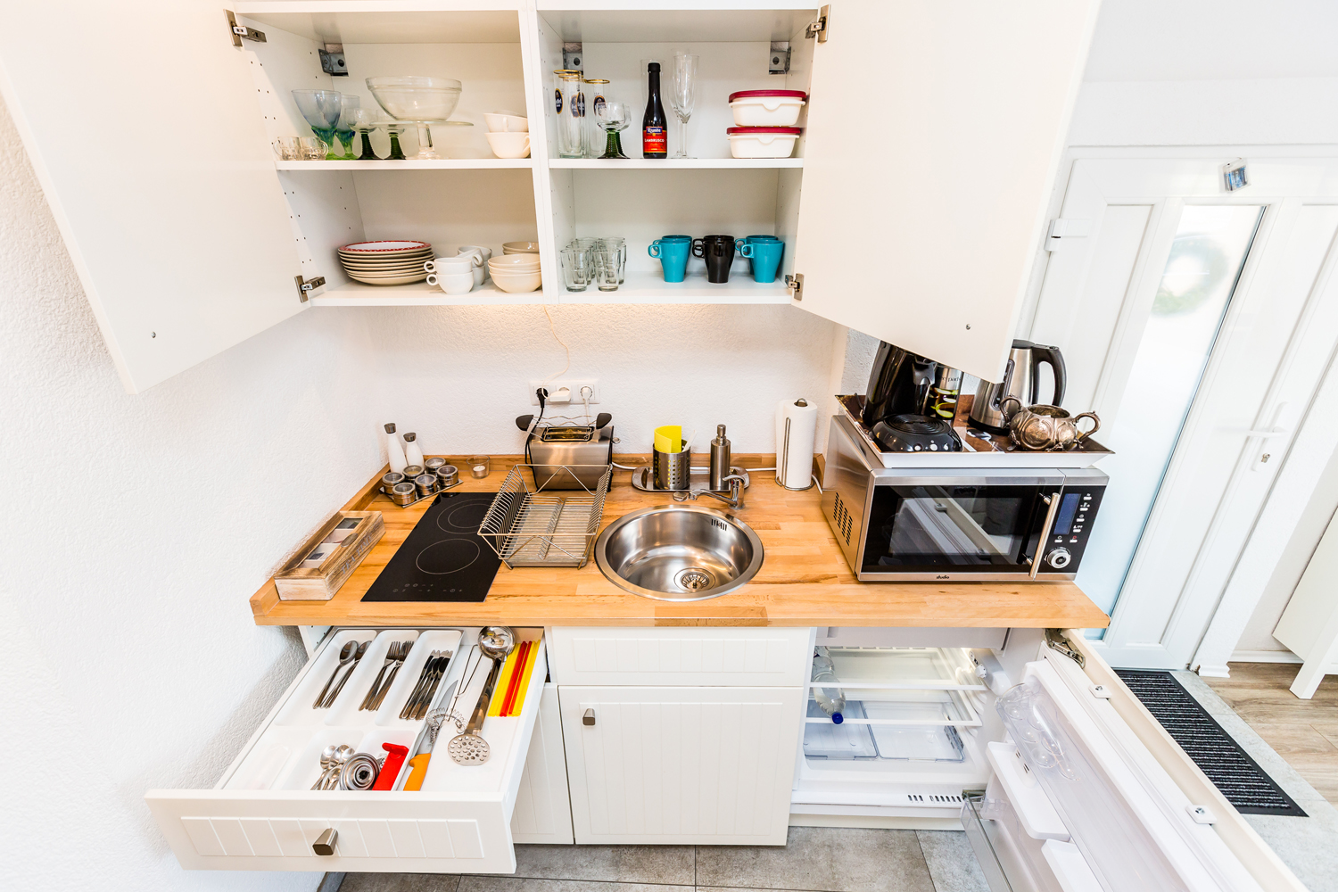 Das Studio verfügt über eine Miniküche mit Kühl-Gefrierkombination und eine Zeranplatte.